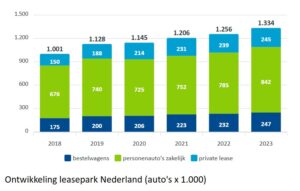 Er zijn ruim 1,3 miljoen leasevoertuigen in Nederland. Alle drie de onderscheiden segmenten (personenauto’s zakelijk, personenauto’s private lease en bestelwagens) groeiden het afgelopen jaar ten opzichte van 2022. Vooral bij zakelijk geleaste personenauto’s (+7,3%) en bestelwagens (+6,4%) was sprake van een toename van het park. De groei van private lease was meer bescheiden (+2,5%). Het totale leasepark telde eind 2023 maar liefst 1.334.000 voertuigen.