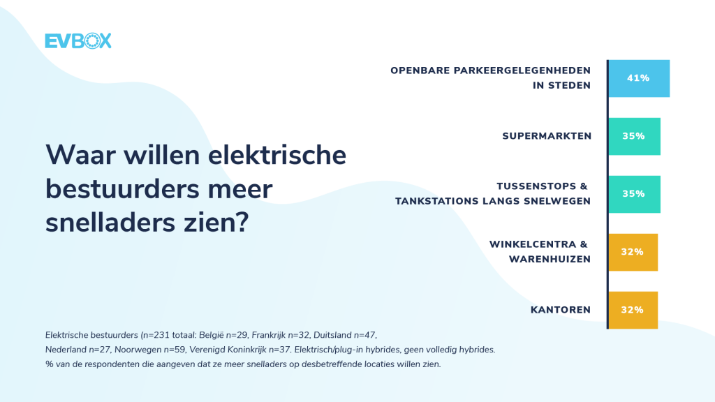 Jaarlijks doet EVBox (internationaal) onderzoek naar de adoptie van elektrische auto’s en eventuele barrières hiervan. Uit de nieuwste versie blijkt dat bestuurders in Europa nog steeds bezorgd zijn over de beschikbaarheid van laadpalen langs de weg, hoewel dat in Nederland een stuk minder is. In het algemeen denkt 29 procent van de Nederlanders geen laadpaal te kunnen vinden waar en wanneer ze die nodig hebben, 28 procent denkt van wel. Het plaatsen van meer snelladers langs de weg kan deze barrière wegnemen, schrijven de onderzoekers. “Dat toekomstige elektrische bestuurders bereid zijn meer te betalen als ze hun auto sneller kunnen opladen, onderstreept die urgentie des te meer.”