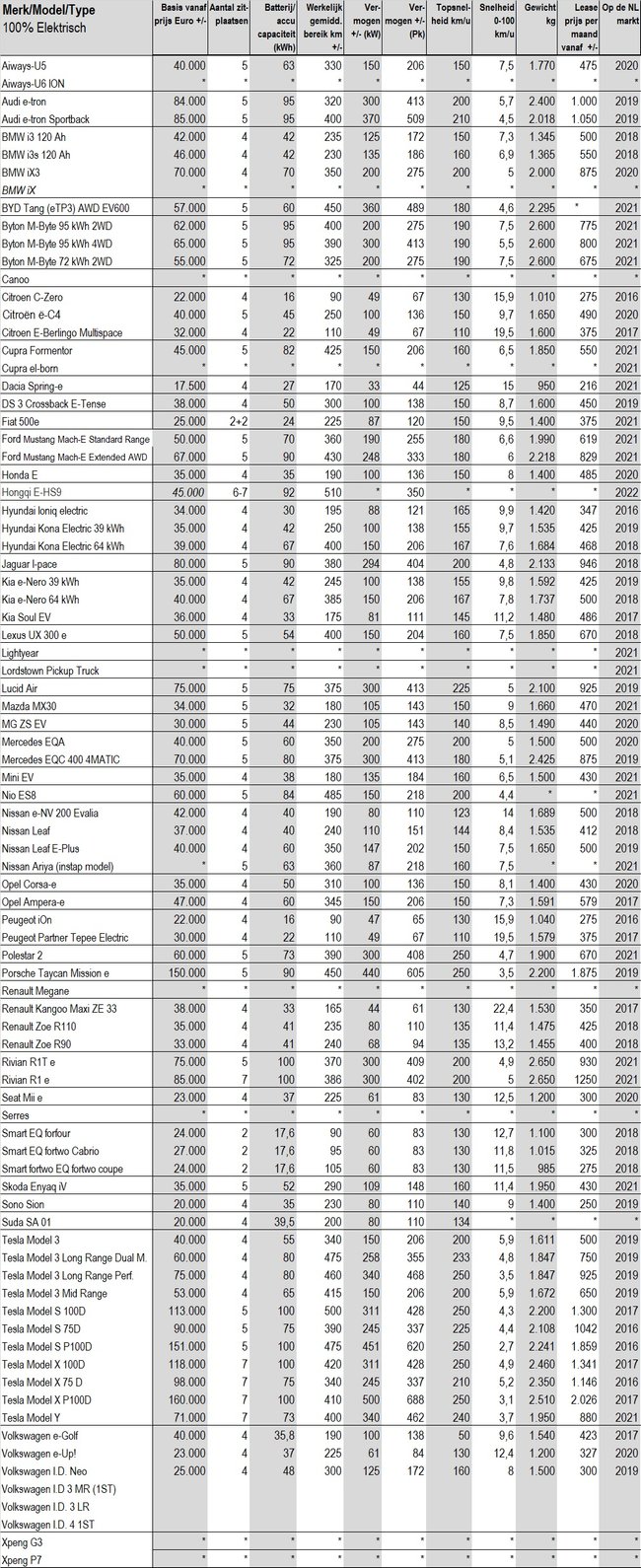 100% Elektrisch wil voor de consument een onafhankelijk en volledig inzicht te geven in aanbod en belangrijkste criteria zoals prijs, accuvermogen en actieradius.