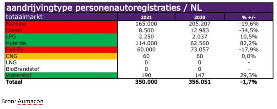 Ook de groei in de verkoop van elektrische auto’s wordt naar verwachting dit jaar gestopt door gebrek aan onderdelen en het wegvallen van subsidies en fiscale voordelen. Automotive kennisbureau Aumacon verwacht een daling van bijna 18 procent in 2021. De verkoop van hybride auto’s neemt met 82,2 procent juist toe ondanks het gemis aan fiscale ondersteuning.