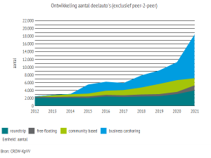 Volgens kennisplatform CROW waren er in 2021 ruim 18.000 van die deelauto’s op de weg afkomstig van professionele deelautodiensten. Die cijfers zijn dus zonder de peer2peer bedrijven waarbij particulieren onderling hun auto’s delen. Anders zouden er in totaal 87.000 deelauto’s zijn maar onduidelijk is hoeveel van die particulieren daadwerkelijk hun auto verhuren.