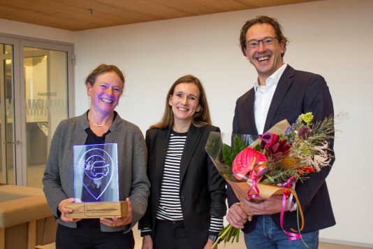 Lutske Lindeman (l), strategisch adviseur energietransitie en mobiliteit en Arjan Oranje (r), programmamanager elektrisch rijden nemen de award in ontvangst van Lonneke van der Horst van ALD Automotive