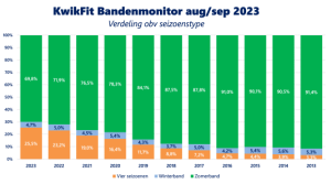 Tijdens het afgelopen zomerseizoen was het aantal autorijders dat met zomerbanden reed historisch laag, blijkt uit de 12e editie van de KwikFit Bandenmonitor. Het aandeel zomerbanden is in vijf jaar tijd flink gedaald, van 87,5 procent in 2018 naar 69,8 procent in het afgelopen jaar.