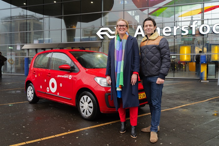 Op 14 februari vieren Greenwheels en NS de 150ste Greenwheels-deelautolocatie met een ‘sleuteloverdracht’ op NS-station Amersfoort Centraal van Michiel Cuppen aan Marise Bezema, Manager Services NS Stations