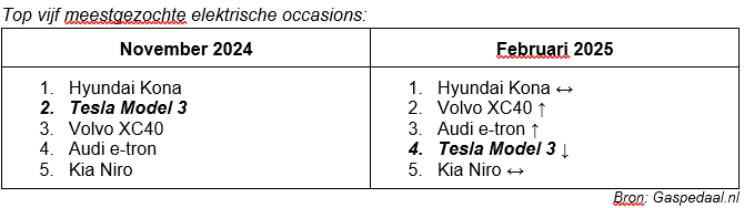 vrijdag 28 februari, 2025Tesla’s Model 3 bezet de vierde plaats in de lijst van meestgezochte elektrische occasions, blijkt uit cijfers van Gaspedaal.nl. Tussen november 2024 en februari 2025 daalde het aantal zoekopdrachten naar de Model 3 met ruim 40%. Niet alleen op de tweedehands automarkt levert Tesla fors in. Ook op de nieuwmarkt krijgt het omstreden automerk flinke klappen.