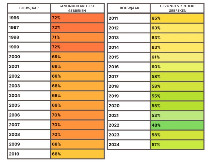Hoewel het adagium ‘hoe ouder de auto, hoe meer gebreken’ wel degelijk opgaat, blijkt uit de onderzoeksresultaten dat ook voertuigen van ná 2020 nog in meer dan 50% van de gevallen minstens één ernstig defect vertonen. Carly wijt dit aan slecht onderhoud.
