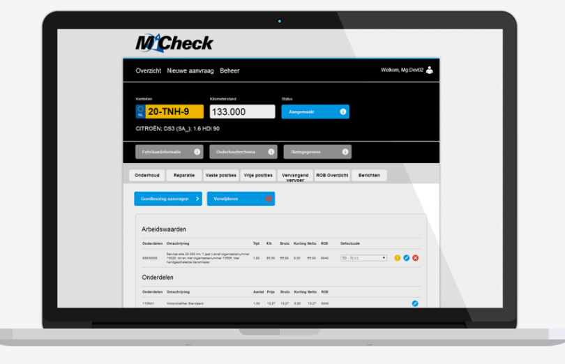 MiCheck-REQUEST is gebaseerd op de originele fabrikanteninformatie en geeft inzicht in onder andere onderhoudsintervallen, werkzaamheden en de bijbehorende flatrate-tijden. Daarnaast worden ook de originele artikelnummers en prijzen getoond voor de benodigde onderdelen bij een onderhoudsbeurt of reparatie.