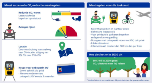 De maatregelen die bedrijven hebben ingevoerd of willen invoeren, zijn door onderzoeks- en adviesbureau CE Delft getoetst op CO2-reductie en impact. De studie laat zien dat de ambitie om de CO2-uitstoot door zakelijke mobiliteit in 2030 te halveren haalbaar is. De hulp van de overheid is daarbij wel nodig, stellen de partijen. De maatregelen vereisen grote capaciteitsverhoging in het openbaar vervoer en uitbreiding van fietsinfrastructuur.