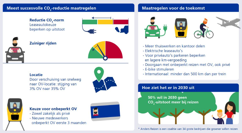 De bedrijven hebben de afgelopen jaren al ervaring opgedaan met het stimuleren van duurzamer reizen. ABN AMRO geeft nieuwe medewerkers bijvoorbeeld standaard een OV-jaarkaart en PwC vervangt vliegreizen onder de 500 kilometer zo veel mogelijk door treinreizen. Verder gaat Eneco geheel over op elektrische leaseauto’s en VodafoneZiggo verhuist naar de omgeving van treinstations.