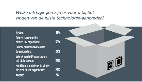 Toch geeft bijna de helft van de bedrijven (46%) aan moeite te hebben met het vinden van betrouwbaar advies om nieuwe technologie te introduceren. Gebrek aan relevante informatie van aanbieders is hiervoor de belangrijkste reden, aldus 22% van de ondervraagden. Andere grote oorzaken die worden onderstreept zijn het gebrek aan kennis binnen de organisatie (24%), het vinden van een aanbieder die bij de organisatie past (15%) en bijkomende kosten (40%).