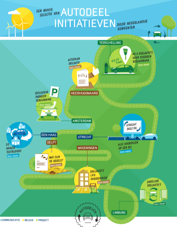 Een selectie van autodeel-initiatieven door Nederlandse gemeenten opgesteld door CROW-KpVV. Klik om de infographic te downloaden