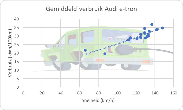 Klik om te vergrotenDe Audi leent zich bij uitstek voor snelle ritten op de Autobahn. Het verbruik is dan fors hoger dan wat de NEDC en WLTC vermelden. Bij 130 km/h zit je op ca 30 kWh/100 km. Bij 150 km/h is dat verbruik gestegen tot 35 kWh/100 km.