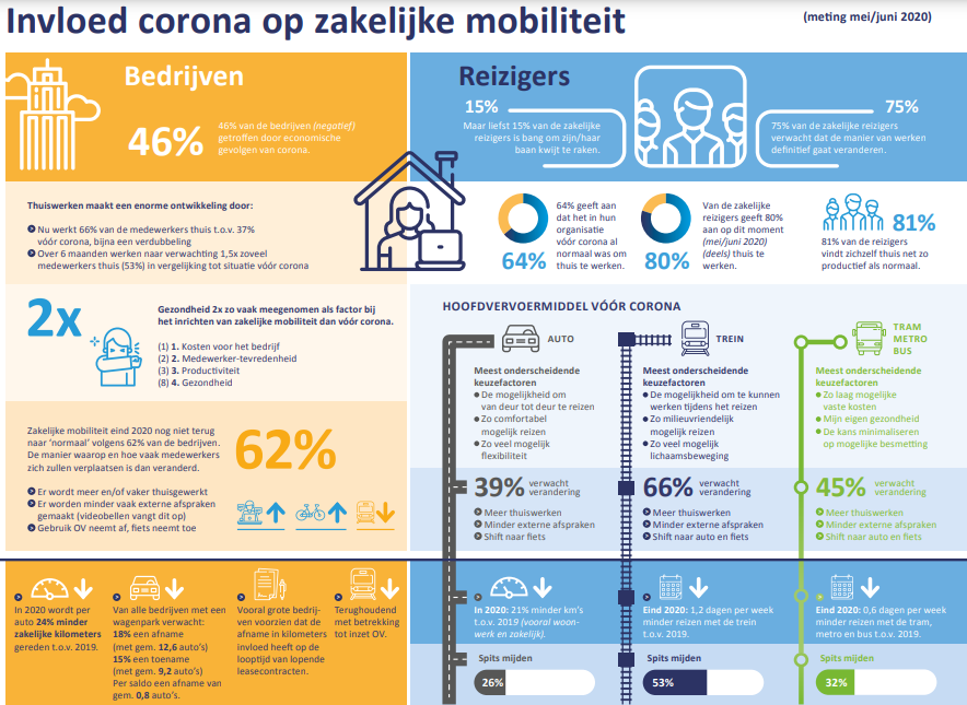 De huidige meting is samengevat in onderstaande infographic. Duidelijk moge zijn dat corona een enorme impact heeft op de zakelijke mobiliteit: 18 procent van alle bedrijven met een wagenpark verwacht een afname van het aantal auto’s. Er wordt dit jaar een kwart minder zakelijke kilometers gereden dan vorig jaar en het OV-gebruik blijft ook over 6 maanden lager dan voor corona. Maar ook: van de zakelijke rijders is 1 op de 8 bang om zijn of haar baan kwijt te raken en 8 op 10 verwacht dat hun manier van werken gaat veranderen. “Thuiswerken wordt nu niet alleen geaccepteerd maar ook omarmd”, aldus Vousten tijdens de online presentatie van het onderzoek bij het vakblad Automobiel Management.