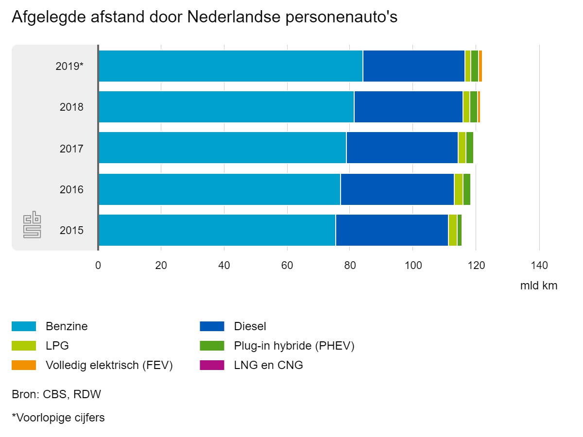 dinsdag 29 september, 2020Nederlandse personenauto’s legden in 2019 opnieuw een record aantal kilometers af: ruim 122,5 miljard. Voor het eerst werden er meer benzinekilometers afgelegd dan diesel-. Grootste stijger is de EV: de afgelegde elektrische kilometers overstijgt voor het eerst het aantal LPG-kilometers.