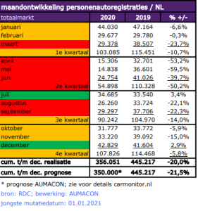 vrijdag 1 januari, 2021De decemberspurt (42.829 registraties!) in de autoverkoop van voornamelijk elektrische auto’s heeft niet kunnen voorkomen dat er in 2020 zo’n 20 procent minder auto’s zijn verkocht ten opzichte van 2019, blijkt uit cijfers van RDC/CARmonitor, bewerkt door AUMACON.