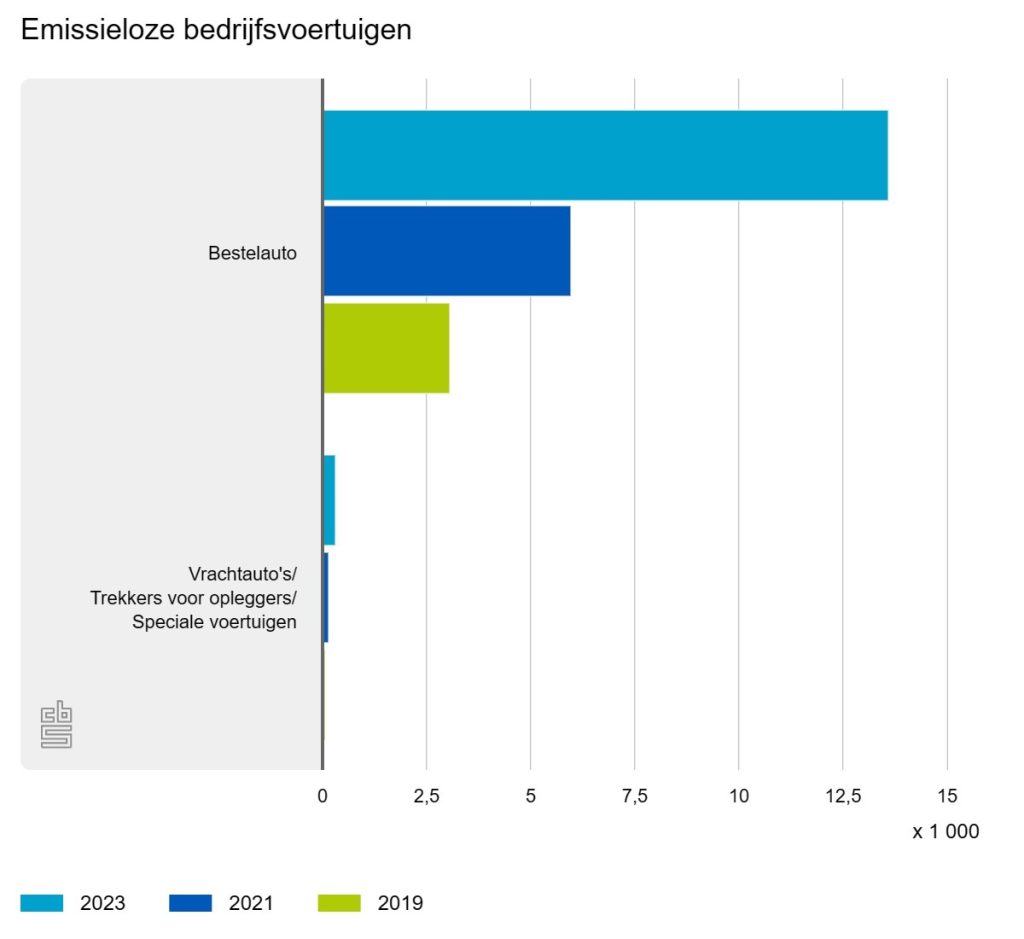 vrijdag 21 juli, 2023Zo’n 1,2 procent van de bijna 1,2 miljoen bedrijfsvoertuigen (vrachtwagens & bestelauto’s) was op 1 januari 2023 emissieloos, blijkt uit nieuwe cijfers van het CBS vandaag. Het aandeel emissieloze bedrijfsvoertuigen is in twee jaar tijd meer dan verdubbeld.