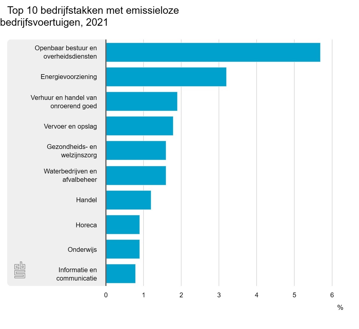 In 2021 werd 0,3 procent van de totaal afgelegde kilometers door Nederlandse bedrijfsvoertuigen gereden door emissieloze voertuigen. In totaal gaat het om 79,8 miljoen kilometer. Voor vrachtvoertuigen was dit 0,02 procent (2,0 miljoen kilometer) en voor bestelauto’s 0,4 procent (77,8 miljoen kilometer).