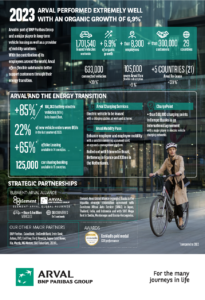 In Nederland groeide het wagenpark met 4,1 procent ten opzichte van 2022 naar 104.800 leaseauto’s, waarvan 25.000 volledig elektrisch – goed voor 39% van alle nieuwe bestellingen in 2023. Met een marktaandeel van 11,3% is Arval de op twee na grootste mobiliteitsaanbieder van Nederland (operationele leasemarkt).