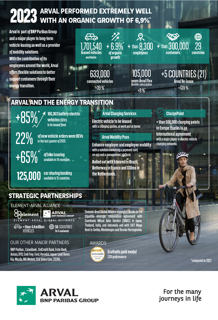Wat elektrische auto’s betreft: in juni versterkte Arval en autofabrikant MG Motor hun samenwerking met de lancering van een gezamenlijk voertuigabonnement: MG Auto Abo powered by Arval. In oktober 2023 bundelde Arval de krachten met het elektrische automerk ZEEKR, samen met BNP Paribas Personal Finance. Bovendien is afgelopen 5 februari een nieuw internationaal partnerschap met autofabrikant BYD aangekondigd.