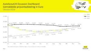 De prijs van de gemiddelde occasion ligt nu grofweg weer op hetzelfde niveau als twee jaar geleden, in oktober 2022. Terwijl vorig jaar oktober de prijs nog lag op 24.101 euro.