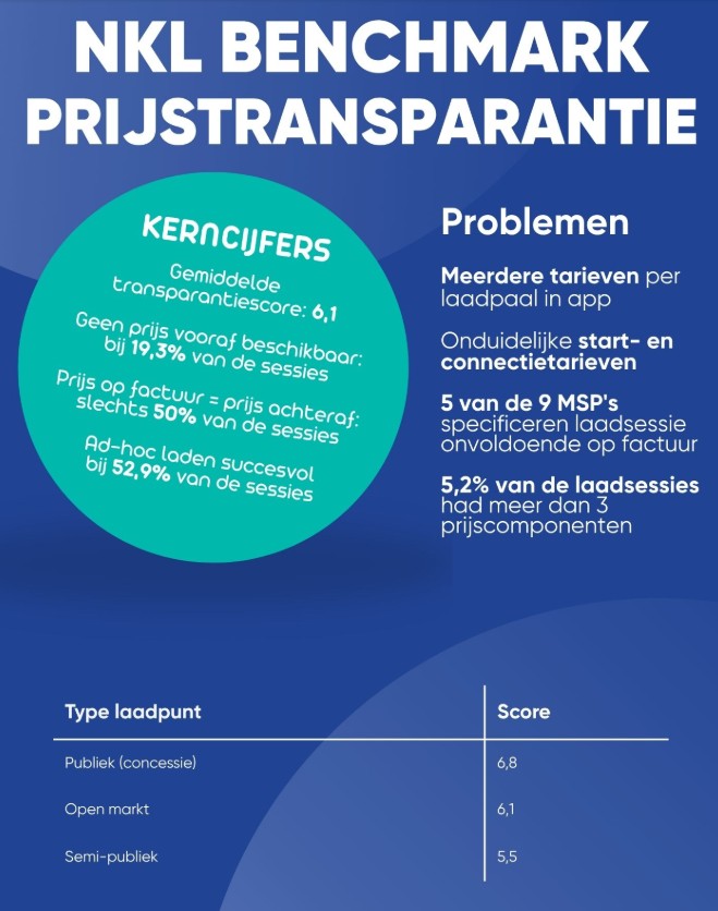 donderdag 26 juni, 2025De prijstransparantie bij het laden van elektrische auto’s is nog steeds ver onder de maat, blijkt uit de nieuwste ‘Benchmark Prijstransparantie’ van het Nationaal Kennisplatform Laadinfrastructuur (NKL). Op essentiële onderdelen is er zelfs sprake van achteruitgang.