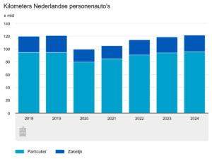 Dat er nu meer kilometers wordt gereden – in totaal bijna 122 miljard kilometer, 2,3 procent meer dan een jaar eerder – komt doordat er meer auto’s zijn. Er waren in 2024 9,9 miljoen auto’s in gebruik, tegenover 9,3 miljoen in 2019. Gemiddeld per auto werd er in 2024 juist 5,7 procent minder gereden dan voor de pandemie.