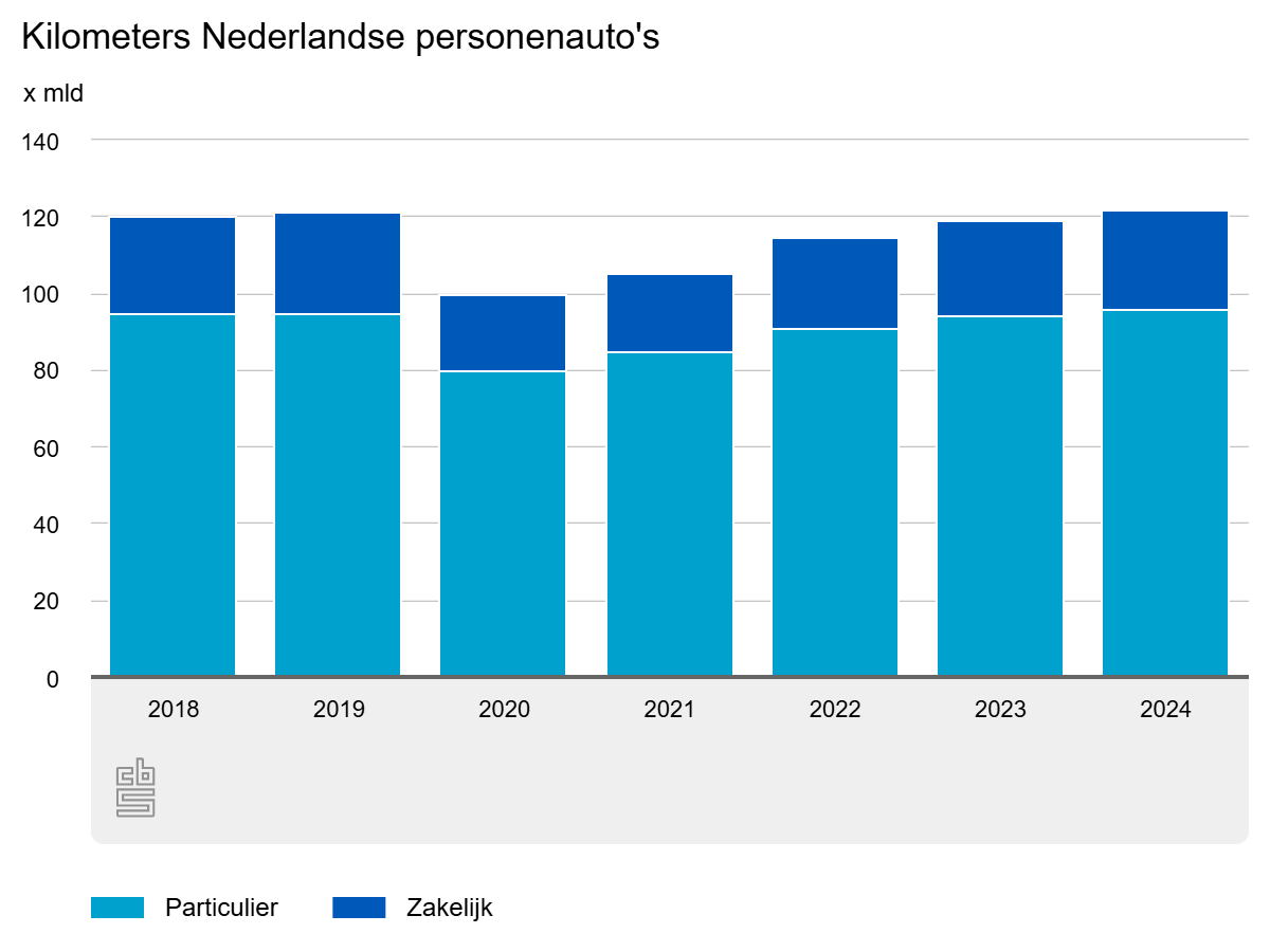 Particulieren rijden samen 96,1 miljard kilometer, dat is meer dan voor de pandemie. Zakelijke rijders zitten met 25,8 miljard onder het niveau van 2019.