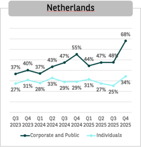 Het verschil tussen zakelijke en particuliere BEV-adoptie is met name groot in België, Nederland en het Verenigd Koninkrijk. Zo is in Nederland 68% van de zakelijke registraties van personenauto’s een EV, tegenover 34% onder particuliere gebruikers. Waarbij overigens de BEV-penetratie onder particuliere gebruikers in 2025 ook aanzienlijk is gestegen.