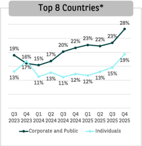 In het laatste kwartaal van 2025 bestond 28,3% van de zakelijke personenauto-registraties in de acht grootste landen van Europa uit volledig elektrische auto’s (BEV’s), tegenover 19,4% bij particulieren.