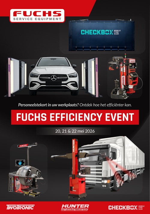 dinsdag 14 april, 2026Fuchs Service Equipment toont op het Fuchs Efficiency Event op Autotron in Rosmalen (20, 21 en 22 mei) onder andere de nieuwe TwoTronic voertuigscanner. Het bedrijf verwacht veel van deze scanner die een geautomatiseerde voertuiginspectie mogelijk maakt in plaats van handmatige controles (zoals nu nog gebruikelijk).