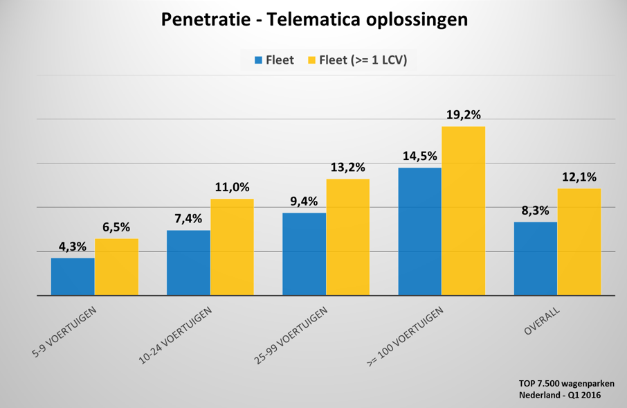 Zoals het gebruik van telematica. Uit het onderzoek blijkt dat de overheid grootafnemer is van telematicadiensten. De penetratie is daar 36% terwijl het gemiddelde over alle markten zo’n 8,3 procent is. Waarbij geldt: hoe groter de organisatie, hoe meer er gebruik wordt gemaakt van bijvoorbeeld kastjes in de auto. “Ook bij fleetowners met een gemengd geel en grijs wagenpark, zie je dat de telematica-acceptatie groter wordt. Daar is de penetratie gemiddeld 20 procent”, aldus Groenen.