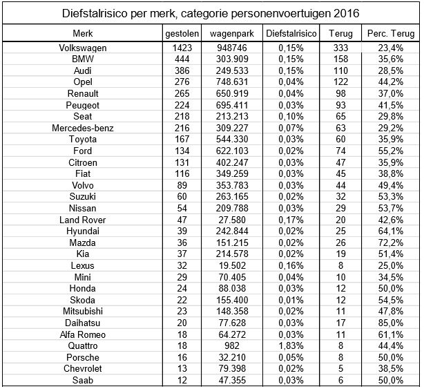 In die laatste categorie daalde het diefstalcijfer met 32 procent ten opzichte van een jaar eerder. In totaal zijn er in de eerste zes maanden van dit jaar 4776 personenauto’s gestolen. Zet deze daling door, dan kan het totale aantal personenauto diefstallen in 2016 zelfs voor het eerst onder de 10.000 voertuigen uit komen.