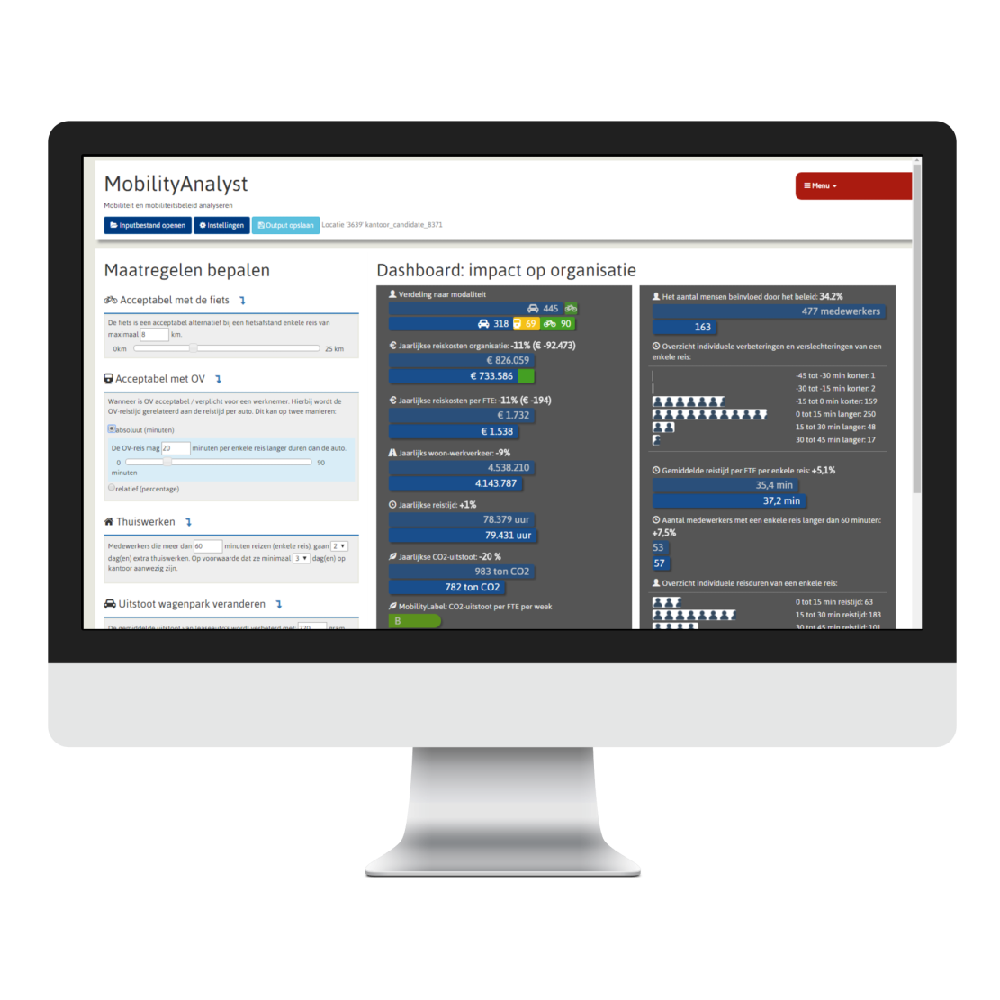 MobilityAnalyst moet direct inzichtelijk maken wat het effect is van specifieke mobiliteitsmaatregelen op de medewerker, het bedrijf en het milieu. “Door te spelen met schuifjes en invoerwaarden maakt de gebruiker zelf eenvoudig scenario’s aan en ziet direct de cijfermatige terugkoppeling van de geselecteerde maatregelen”, aldus ontwikkelaar Thijs Brentjens.