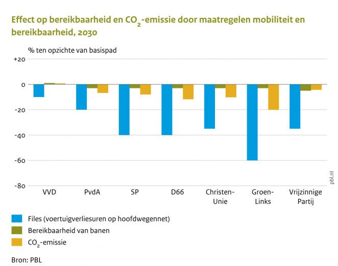 Beprijzing van het autorijden blijkt populair bij veel partijen, in ieder geval bij PvdA, SP, D66, ChristenUnie, GroenLinks en Vrijzinnige Partij. Altijd in combinatie met andere maatregelen zoals minder geld voor wegen en meer geld voor openbaar vervoer en fiets. Waarbij het PBL benadrukt dat kilometerbeprijzing een sterke vermindering van files oplevert (en minder CO2-uitstoot), maar reizen ook duurder maakt waardoor de bereikbaarheid van banen toch afneemt. De VVD kiest niet voor beprijzing, maar voor investeringen in weginfrastructuur. Ondanks de kleinere afname van de files, is dit gunstiger voor de bereikbaarheid van banen, aldus het PBL.