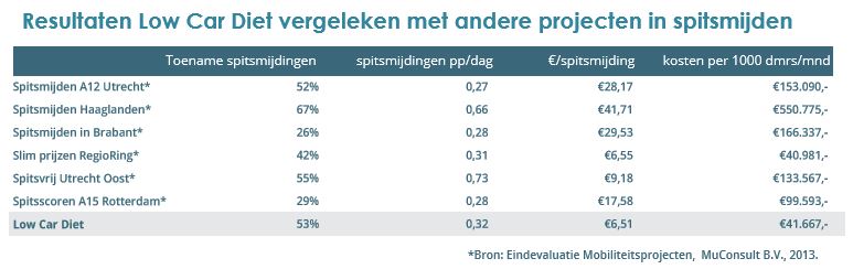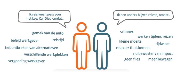 maandag 20 februari, 2017Uit nieuw onderzoek naar het blijvend effect van het Low Car Diet blijkt dat, net als bijvoorbeeld de verschillende spitsmijdenprojecten, veel deelnemers hun reisgedrag structureel hebben aangepast. Maar tegelijkertijd zegt een derde van de deelnemers gestopt te zijn vanwege het beleid van de werkgever.