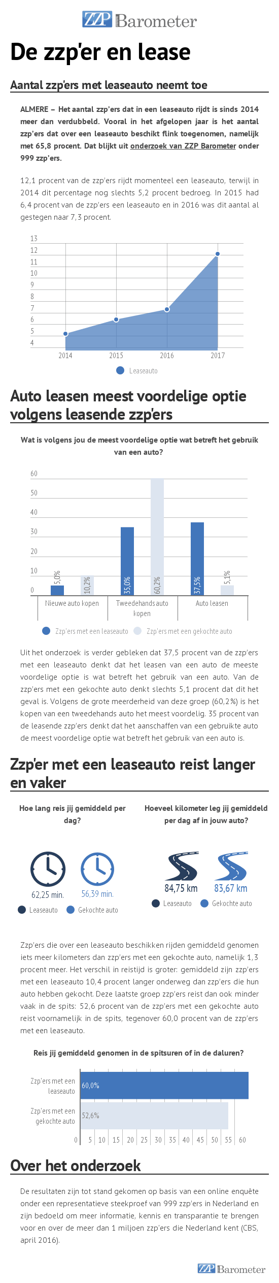 Momenteel rijdt 12,1 procent van de zzp’ers een leaseauto, terwijl in 2014 dit percentage nog slechts 5,2 procent bedroeg. In 2015 had 6,4 procent van de zzp’ers een leaseauto en in 2016 was dit aantal al gestegen naar 7,3 procent.