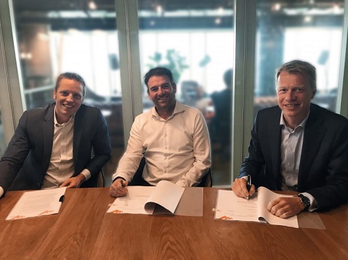 vlnr: Dirk Gaasbeek van Leaseplan met Denis van Altena van James Autoservice en Erik Henstra van Leaseplan ondertekenen het leasecontract