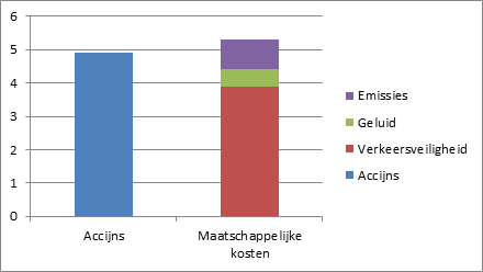Terwijl de negatieve maatschappelijke effecten van autorijden door emissies, geluid en verkeersveiligheid worden (gemiddeld) al in rekening gebracht bij automobilisten (zie figuur). De huidige brandstofaccijns is min of meer even hoog als de maatschappelijke kosten van milieu, geluid en verkeersonveiligheid.