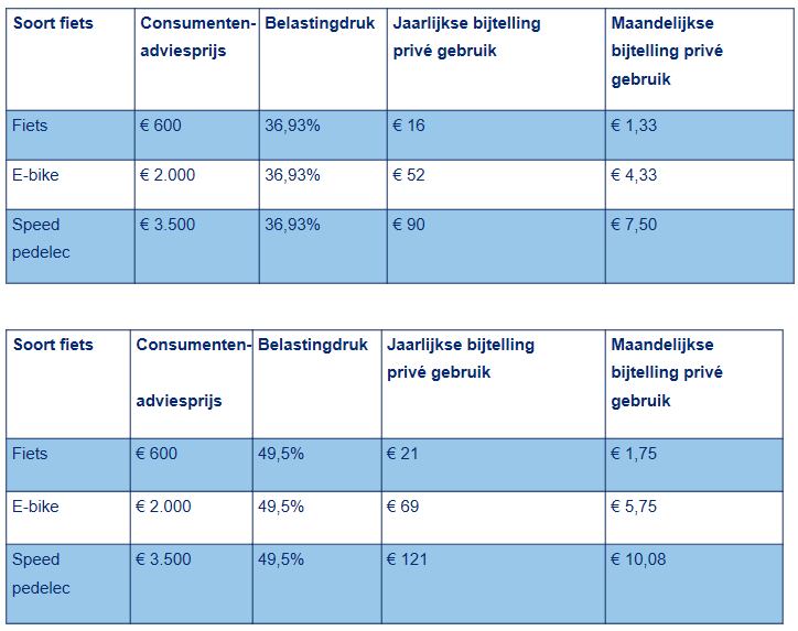 VNA heeft een voorbeeldberekening gemaakt van de maandelijkse en jaarlijkse kosten voor het privé gebruik van de zakelijke fiets bij 7 procent bijtelling: