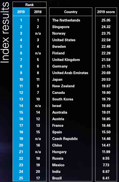 Voor het onderzoek zijn wereldwijd vijfentwintig landen beoordeeld op het gebied van overheidsbeleid en wetgeving, de kwaliteit van de infrastructuur, de beschikbaarheid van nieuwe technologieën en de verwachte acceptatie door de consument