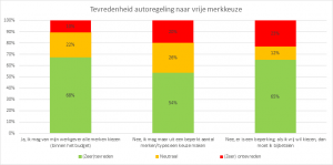 En zo’n merkenbeleid heeft dus invloed op de medewerkerstevredenheid. Van de medewerkers die uit elk automerk mag kiezen is 68% (zeer) tevreden over hun autoregeling. Slechts 10% is (zeer) ontevreden. Als er maar uit een beperkt aantal merken gekozen mag worden, dan daalt de tevredenheid over de autoregeling van 68% naar 54% en verdubbelt het aantal ontevreden medewerkers naar 20%.