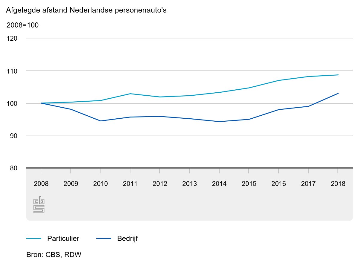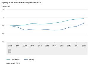 Het aantal door particulieren gereden kilometers nam eveneens toe (met 95,3 miljard), maar dat is een stijfging van een kleine 0,4 procent. En dat komt vooral door de toename van het aantal auto’s op de weg. Dit lag in 2018 namelijk 2,2 procent hoger dan een jaar eerder. Met zijn allen reden we in 2018 in totaal zo’n 121,4 miljard kilometer.