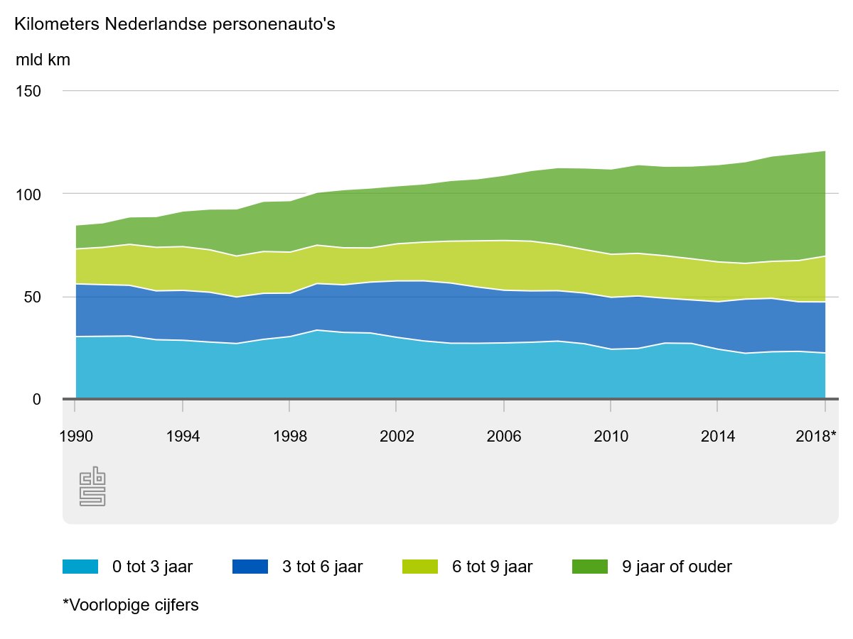 Ten opzichte van 1990 zijn er de helft meer kilometers gereden door personenauto’s, bestelauto’s, zware vrachtvoertuigen en bussen samen, van 102 miljard naar 150,6 miljard kilometers. Met bestelauto’s werd in 2018 iets meer dan 18 miljard kilometer afgelegd, ruim een verdubbeling vergeleken met 1990. De grootste groei (118 procent) vond plaats in de periode 1990 tot en met 2008. Gedurende de economische crisis daalde het aantal bestelauto’s en daarmee ook het aantal afgelegde kilometers. Daarna namen de bestelautokilometers jaarlijks weer toe tot het hoogste niveau ooit in 2018. Steeds meer kilometers worden afgelegd met bestelauto’s van negen jaar of ouder. Het aantal kilometers dat met deze oudere bestelauto’s werd gereden liet tussen 1990 en 2018 een groei met een factor 9 zien, van 0,7 miljard naar bijna 6 miljard kilometer.