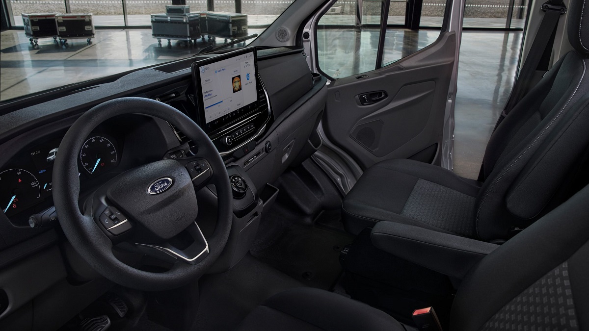 De E-Transit introduceert het SYNC 45-communicatie- en informatiesysteem in de bedrijfswagens van Ford. Het systeem is twee keer sneller dan SYNC 3 en is intuïtief te bedienen via een 12-inch touchscreen, dat niet reflecteert en met één veeg schoon te maken is.